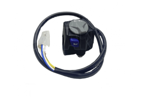 This genuine OEM handlebar light switch is a direct replacement part designed for KTM, Husqvarna, and GasGas enduro motorcycles. It features integrated controls for high and low beam selection along with a dedicated blue horn button, ensuring reliable operation of your bike's essential electrical systems.