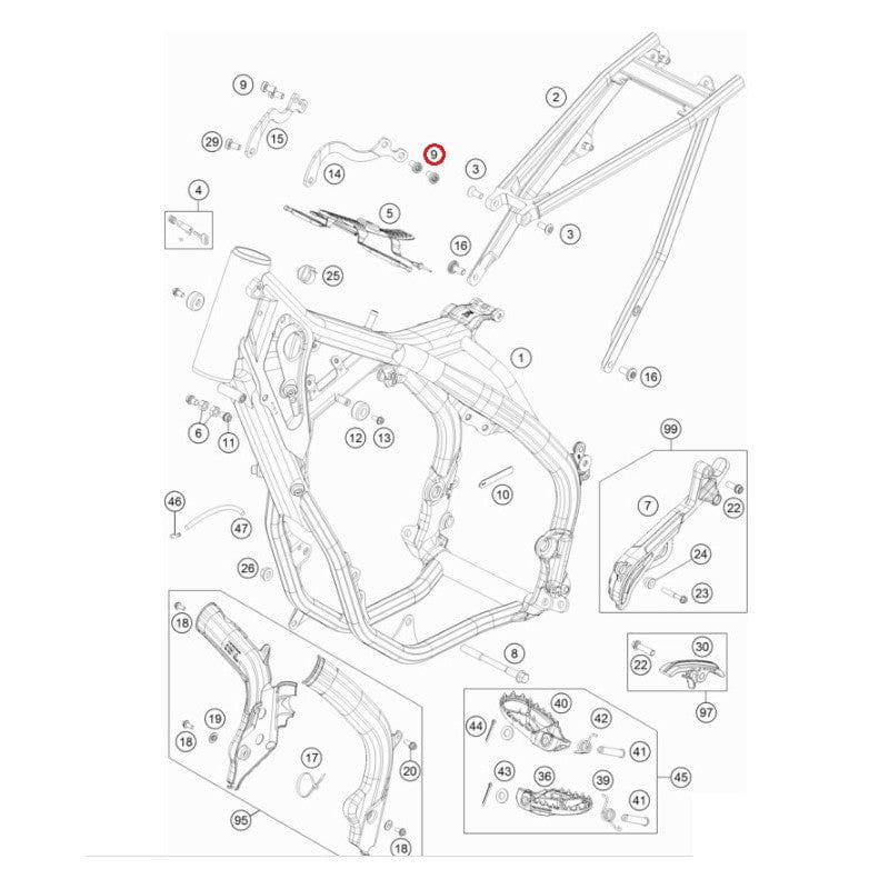 This genuine OEM M8x15 Torx 45 screw is a versatile fastener used across various critical assemblies on KTM, Husqvarna, and GasGas motorcycles. It is specifically designed for high-stress areas such as the frame mounting points, rear brake control systems, and shifting mechanisms. The screw features a pre-applied thread-locking compound to ensure a secure fit and prevent loosening due to engine vibration.